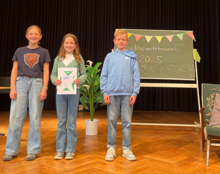 Auch in diesem Jahr fand in der Aula der Vorlesewettbewerb der 6. Klassen statt. Unter voller Unterstützung ihrer Klassen lasen am 5. November die Klassensiegerinnen und -sieger Clara (6a), Aurelia (6b), Mina (6c), Karlina (6d), Philipp (6e) und Sophie (6f) aus ihren Büchern vor. Nach der zweiten Runde, in der ein Fremdtext gelesen werden musste, kürte die Jury Karlina aus der 6d zur Siegerin. Platz 2 und 3 gingen an Aurelia und Philipp (s. Bild). Karlina wird das Ceci nun in der nächsten Runde vertreten. Wir wünschen ihr beim weiteren Verlauf des Wettbewerbs viel Erfolg!