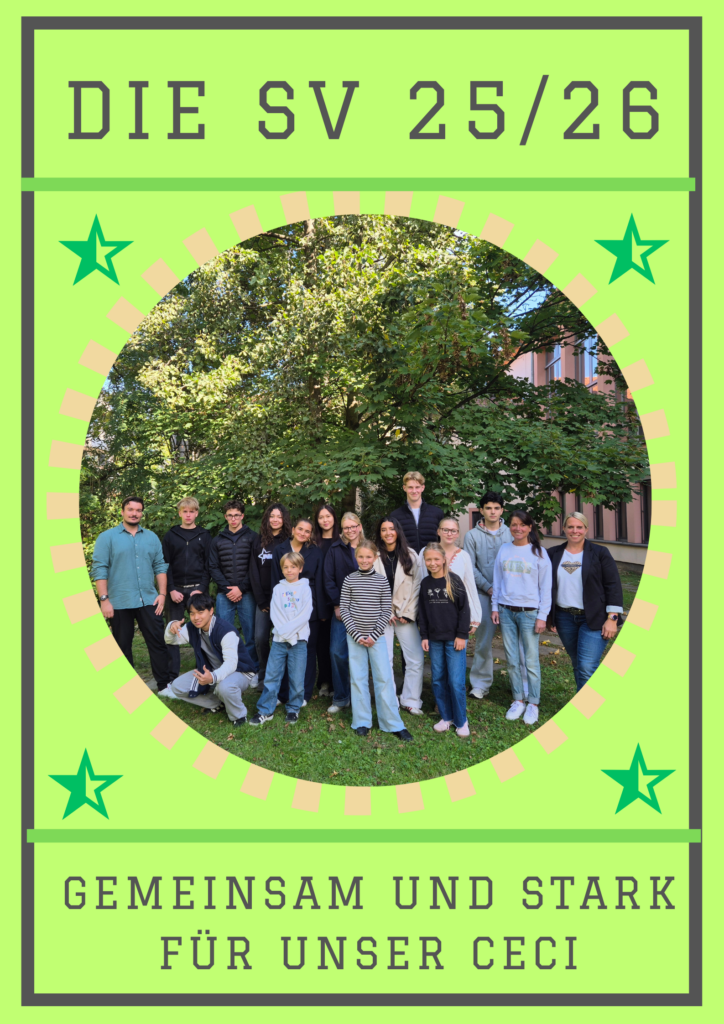 Die SV besteht aus jeweils drei Vertretern (Sprechern) der Unter-, Mittel- und Oberstufe, drei weiteren Vertretern aus den Reihen aller Klassen- und Stufensprechern und den drei Vertrauenslehrerinnen und -lehrern. Wir treffen uns einmal im Monat im Oberstufenraum und besprechen dabei zum Beispiel die Organisation von Events wie „Ceci goes talent“ oder den „Charity Run“. Außerdem ist das Thema „Ceci-Pullis“ oder die Gestaltung unserer Schule ganz wichtig und wird von uns besprochen und diskutiert. Wir vertreten dabei also vorrangig die Interessen aller Schüler und suchen stets nach Möglichkeiten, den Schulalltag am Ceci positiv mitzugestalten.