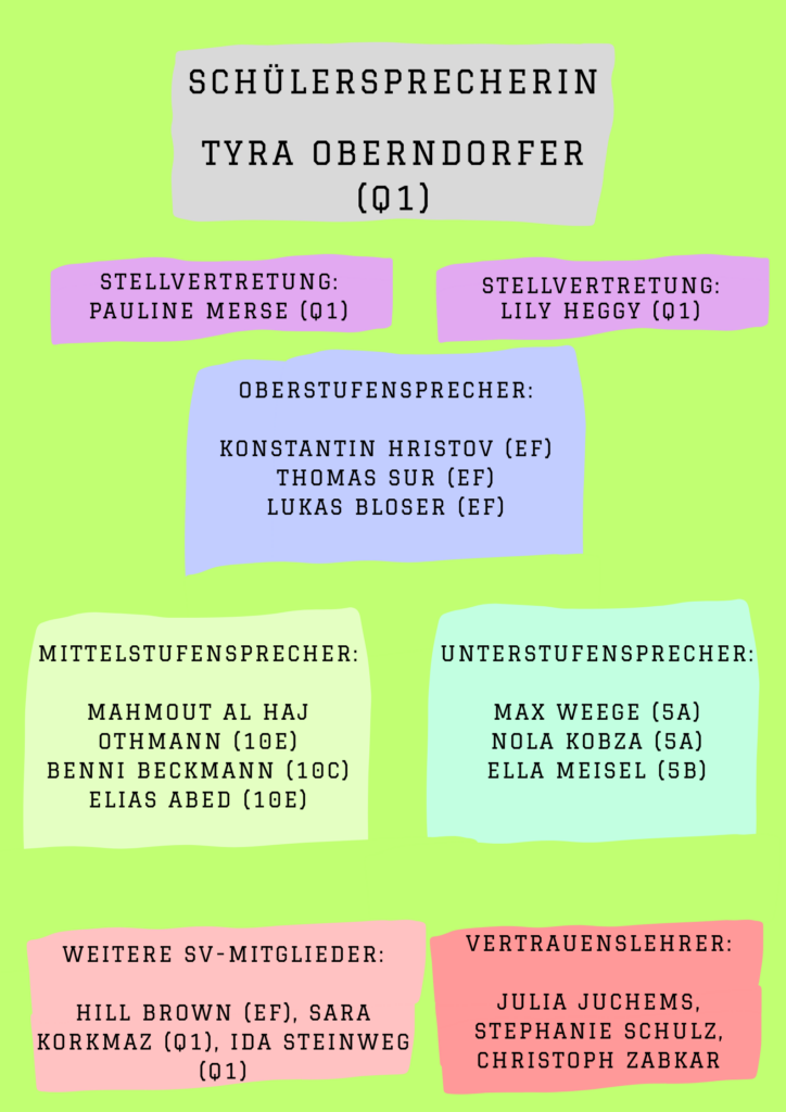 Ein Team aus 16 Schülerinnen und Schülern der Jahrgangsstufen 5 bis Q2 bilden die diesjährige Schülervertretung, die zu Beginn des Schuljahres bei der ersten Schülerratsitzung gewählt wurde. Das Interesse an der Mitarbeit in der „SV“ war groß und zahlreiche Klassensprecherinnen und Klassensprecher aus allen Jahrgängen bewarben sich mit häufig motivierenden Vorstellungsrunden um die begehrten Plätze in der Schülervertretung. Die konkreten Ziele und Projekte werden nun in den kommenden Sitzungen geplant und besprochen. Themen sind dabei sicherlich die Gestaltung der Schultoiletten, die Nutzung des Oberstufenraums, ein Charity Run oder die legendäre Talentshow.
